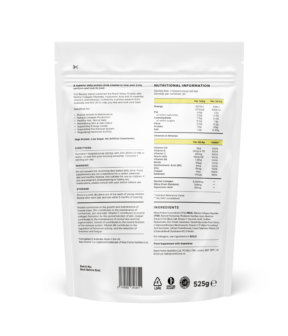 INGREDIENTS: Whey Protein Concentrate (75%) (MILK), Marine Collagen Peptides (FISH), Natural Flavouring, Thickener: Xanthan Gum, Bamboo Extract (75% Silica), Salt, Vitamin C (Ascorbic Acid), Sodium Hyaluronate, Zinc Citrate, Sweetener: Steviol Glycosides from Stevia, L-Selenomethionine, Nicotinamide, Vitamin E (D-Alpha Tocopheryl Acid Succinate), Calcium Pantothenate, Cupric Sulphate, Vitamin D3 (Cholecalciferol), Pyridoxine HCl, D-Biotin